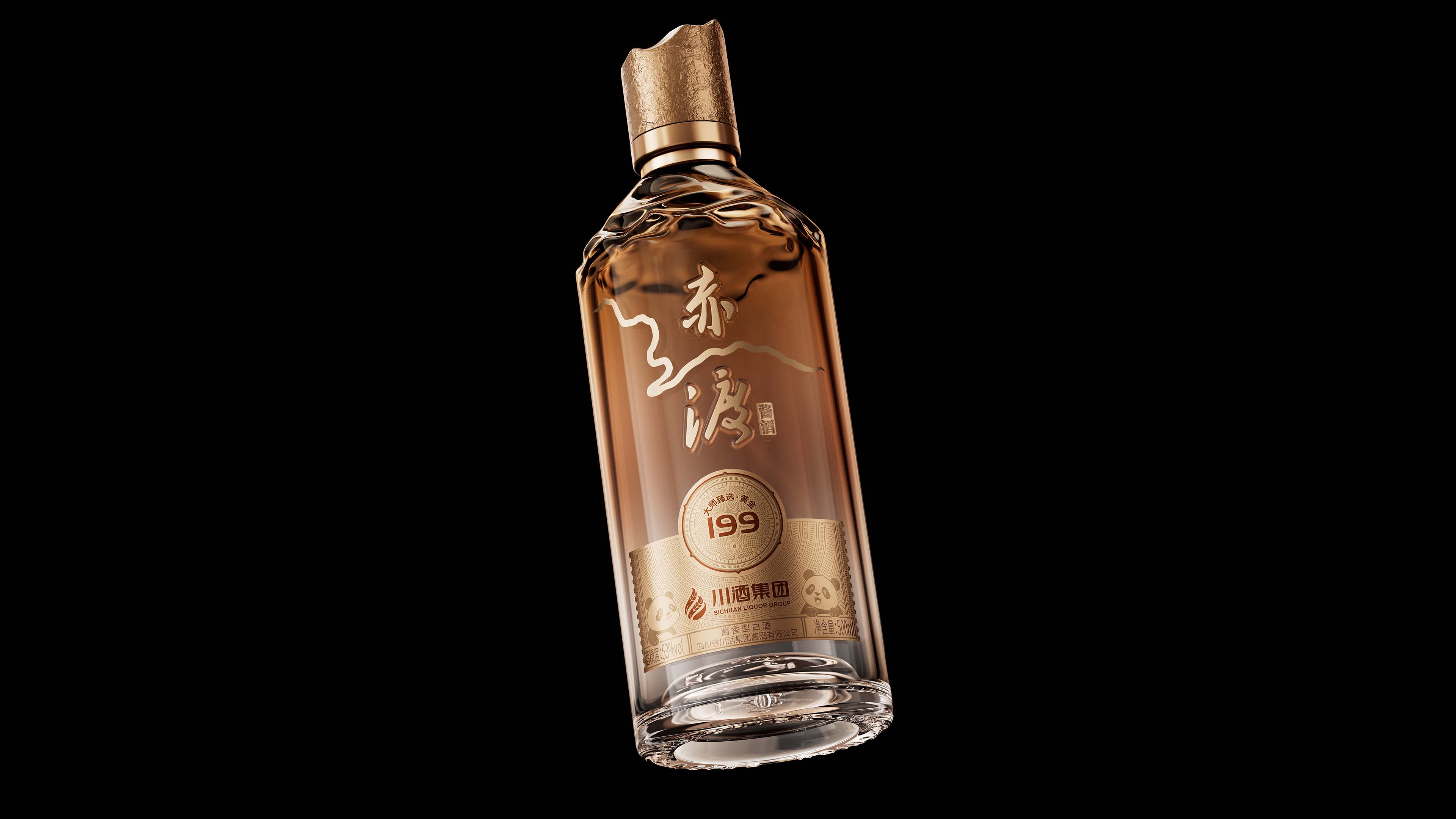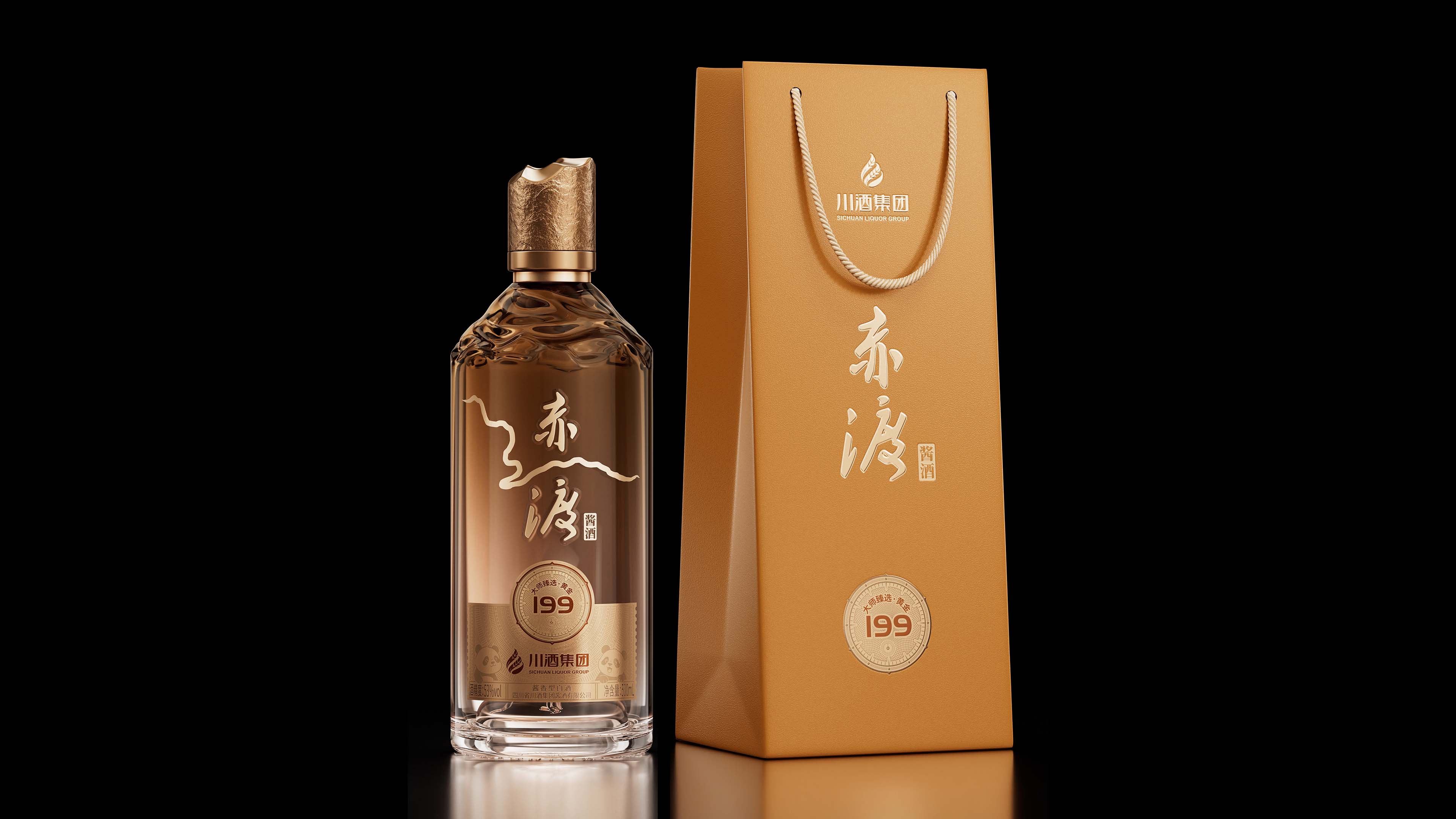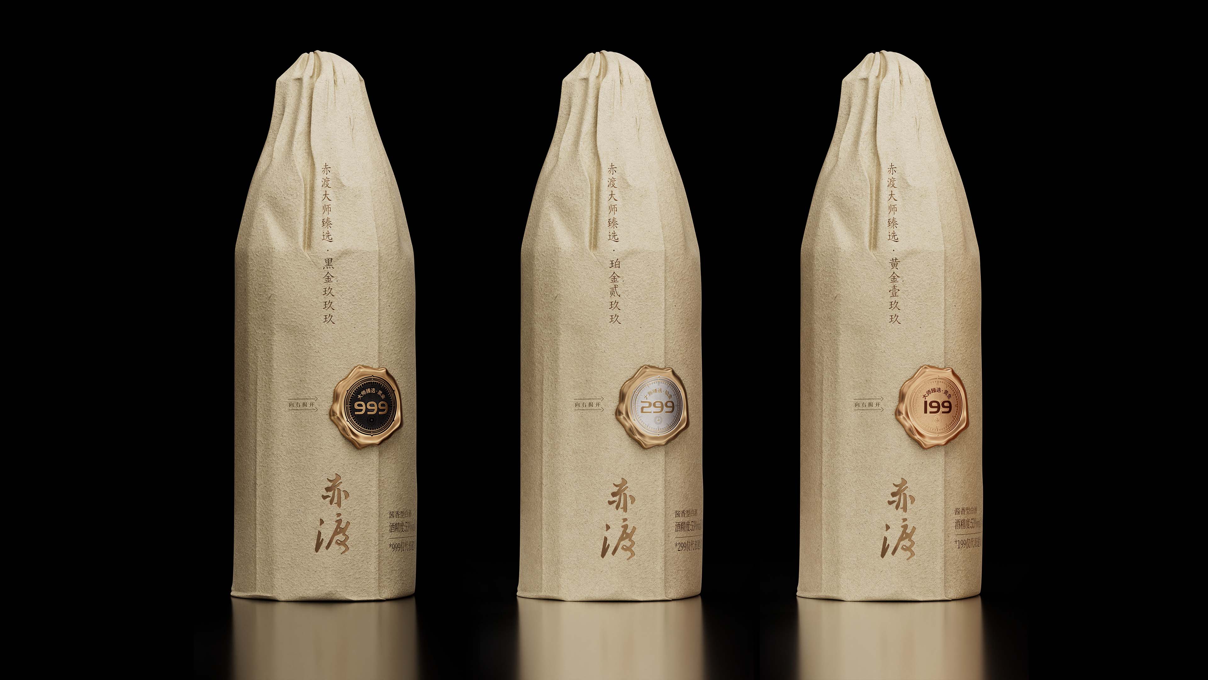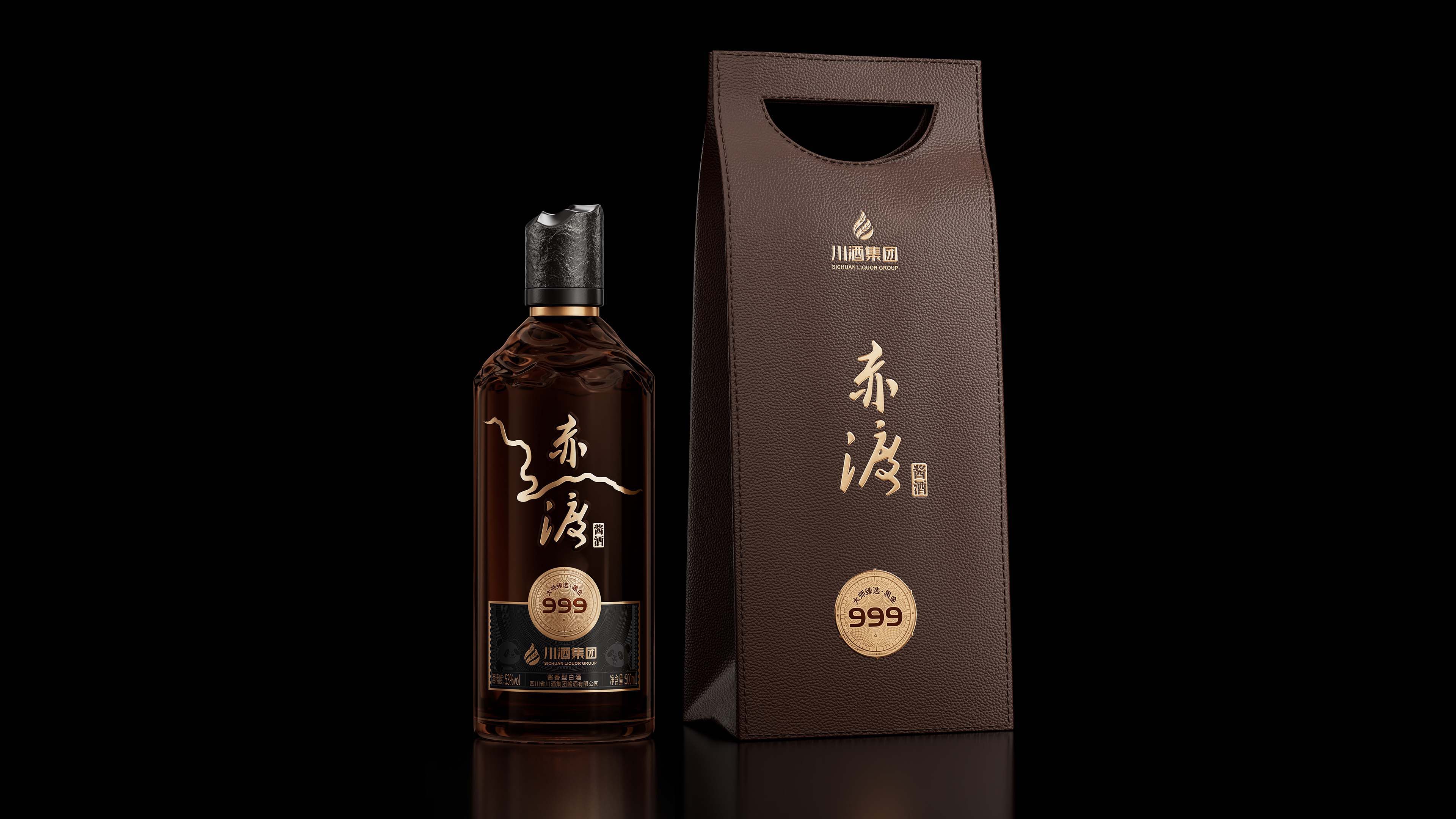 赤渡品名,因四渡赤水而来。而四渡赤水的故事在中国家喻户晓,蕴藏着【百折不挠,勇往直前】的精神。由此,段高峰设计提炼出【千锤万凿出深山】的话语,开始此款产品的设计。器型上,选择保留茅型瓶,突出酱酒的特性,彰显产品的正宗感;在瓶肩融入凿石肌理线条,以彰显赤渡品牌个性;瓶盖同样选用具有份量感的金色凿石瓶盖,体现产品的价值感。字体上,赤渡品名选用了【毛体】,让这款产品的故事性更强。同时,赤渡品名又与象征“古蔺与习水的赤水河流域”的核心图形组合,丰富了赤渡品牌故事的形象表达。