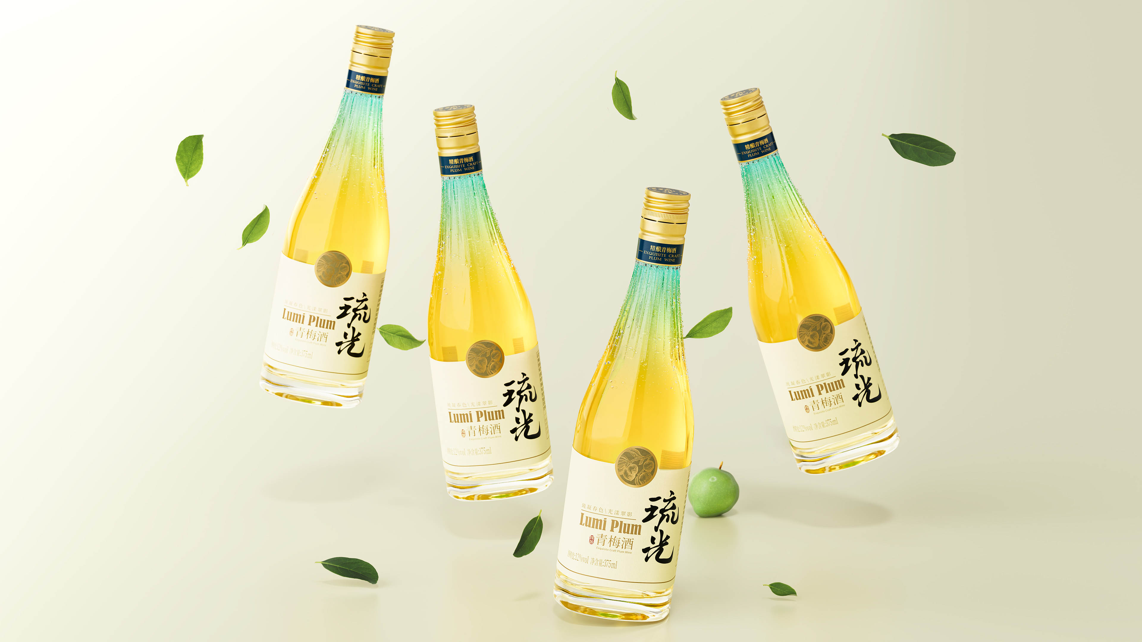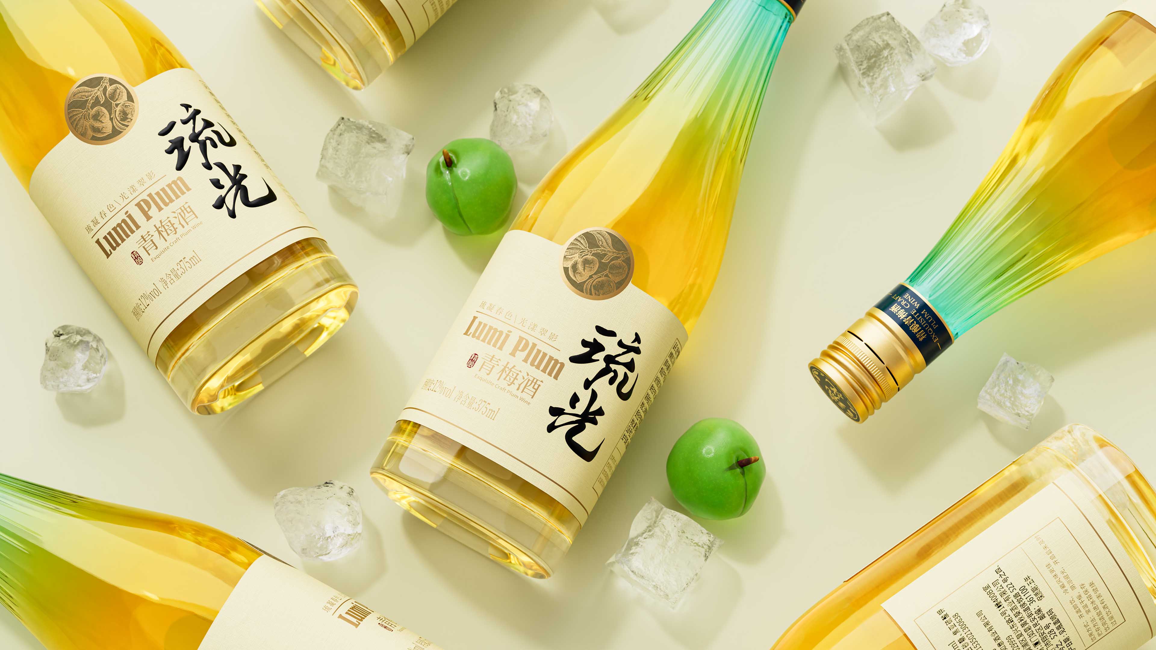 琉璃之物,自然之光。琉光青梅酒,以瓶颈为光之原点,设计放射状线条,通过玻璃切面的精细打磨、线形切割,巧妙利用光线透过玻璃折射出璀璨的光辉,让瓶体晶莹透亮的美境发挥最大效果,呈现出令人惊喜的光影流动之美。色彩上则利用了酒体本身的颜色组合,从瓶脖切面的蓝色渐变到琥铂色酒体的自然转圜,完美呈现出琉光品名所直指的琉璃感。标签采用带有肌理感的特种纸张,琉光的书法字体在米黄色的特种纸上呈现出东方特有的意境底蕴。黑色、金色与米色的搭配与瓶身整体调性浑然一体,透出品牌独有的美学。